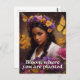 This vibrant item features an oil painting of a beautiful black girl wearing a floral crown and surrounded by flowers and butterflies, along with the text "Bloom where you are planted." A colourful bloomcore aesthetic artwork with pinks, purples, yellows, and orange.