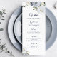 Romantic watercolor botanical floral and greenery in soft yellow, dusty blue, and grey, elegant and romantic, great wedding menu for modern wedding, romantic wedding, and botanical garden wedding.