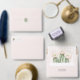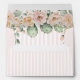 This simple wedding envelope features a name and return address on the back flap in sage green on a blush pink background. The inside has a watercolor graphic of a cactus in bloom.