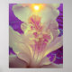 Closeup fantasy depiction of an elegant white iris in it's bloom over a purple like pond with a capture of the sun. This is a true beauty and a masterpiece of art.