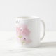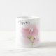 The cup features a delicate white ceramic design adorned with a floral illustration. The illustration consists of two blossoms on a single stem, set against a soft pink background. The word “Flower” is written above the illustration in a cursive, stylish font, adding to the cup’s simple and elegant aesthetic.