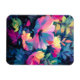 A bold, painterly garden bursting with blooming flowers in pink, blue, and purple.