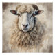 A sheep with detailed wool and expressive eyes is portrayed against a soft, blurred background. The natural colours enhance the lifelike appearance of its curly fleece.