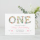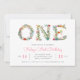 Blooming floral invitation for your little girl's first birthday features "ONE" spelled out in chic flowers, with your party details beneath in pink and grey lettering.