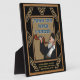 For the significant people in your life, give this very special remembrance during this year's "Days of Awe": A glossy, stand-alone plaque featuring an original digital painting by artist, Leslie Sigal Javorek, that portrays an Art Deco inspired faux picture frame in black and gold, rendering of a Rabbi blowing the Shofar that has a 3-d illusion, transliteration of the Hebrew traditional greeting, PLUS 3 customisable lines of text. (limitation of 20 characters per line).
