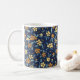 Elegant coffee mug in moody navy blue with pops of yellow and orange – perfect for gifting and your morning coffee.
