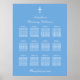 Blue 12 Table Christening Seating Chart Poster, please personalise the name of the person being christened and the names of the guests along with any of the other text that you may wish to personalise. A stylish seating chart poster featuring a white cross and elegant white text on a lovely gentle blue background.