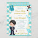 Cute Black Hair boy holy first communion design with blue striped background, gold foil confetti, bible, cross, dove and other religious clipart
