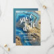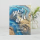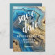 Modern save the date card featuring a blue / aqua, geode / agate design with gold foil accents. Personalised with your event details.