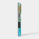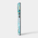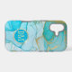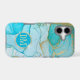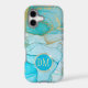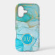 This elegant phone case features your two letter monogram in pale gold at the centre of a blue circle banner that is double framed in gold. The banner is placed on an abstract background in tones of blue alcohol ink patterns with glittery gold outline. Pretty!