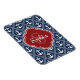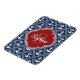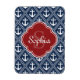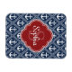 A nautical navy blue and white anchor pattern within a diamond shape background. On top of the background pattern is a red stylish quatrefoil shape label frame featuring customisable name and monogram templates.
