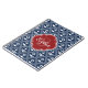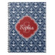 A nautical navy blue and white anchor pattern within a diamond shape background. On top of the background pattern is a red stylish quatrefoil shape label frame featuring customisable name and monogram templates.