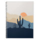 Mexican desert at sunrise illustration with sun, mountains and cactus decoration in navy blue, orange, blue and beige colours on pastel grey background