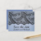 This postcard features a blue and black faux lace design. On the front, most of the card features a faux black lace graphic design, "Save the date" and the couple's name is written underneath on a blue background. The back of the card features information written with black font on a blue background. Purchase yours today!