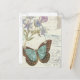 © Pela Studio / Wild Apple. A blue and brown butterfly with a purple flower. There is a butterfly silhouette in the background as well as French words.