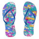 Captivating abstract spin art designed pair of flip flops featuring colourful shades of blue, pinks and yellows.