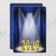 Commencement ceremony invitation for the class of 2025 in blue and gold on stage with spotlights.