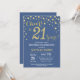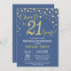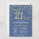 21st Birthday Invitation with Blue and Gold Glitter Diamond Background. Gold Confetti. Adult Birthday. Male Men or Women Birthday. For further customisation, please click the "Customise it" button and use our design tool to modify this template.