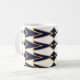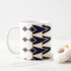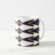 This mug has an art deco design of triangles and diamonds that look like bowties in blue and gold.
