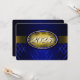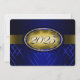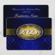 Blue and gold graduation invitation with light and dark blue stripes and a gold ribbon going across showing the year of graduation. The back of the card is blue with light gold font for people to fill in the graduation party invitations.