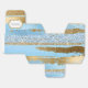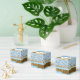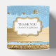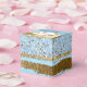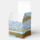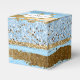 Chic wedding or special occasion favour gift box, with graphics of a blue and gold foil and glitter looking abstract striped look. A gold and white decorative plaque, on the lid of the box, has custom text ready to personalise for your event.