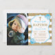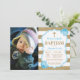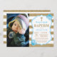Blue and Gold Glitter Baptism Invitation with custom photo. Boy Baptism. First Communion. Christening. Child Dedication. Gold and White Stripes. Blue Floral Flower. For further customisation, please click the "Customise it" button and use our design tool to modify this template.