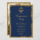 Elegant blue and gold law school graduation party invitation featuring gold glitter frame, and photo on reverse. Copyright Elegant Invites, all rights reserved.