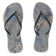 A cute pair of flip flops featuring a beautiful hand drawn mandala pattern in navy blue and gold tones.