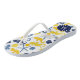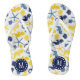 The pattern on these fun flip flops contains blue and gold seahorses, starfish, and seashells. The images are placed on a white background. Your monogram is in white within a star lined, navy blue banner on each heel.