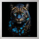 A majestic tiger with striking blue eyes that looks forward to a black background, surrounded by a range of blue flowers and green leaves. The tiger's fur is rendered with great detail, highlighting various shades of orange, black and white.