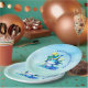 Blue and green Axolotl themed boy's birthday party personalised paper plates. A cute axolotl in a birthday hat with balloons.