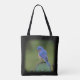 Pretty Bluebird Tote Bag. Gifts for mum or grandmother. Brilliant jewel tone colours show off this lovely bluebird perched on dragonfly art enjoying and surveying a serene garden. Sweet pretty gift for bluebird fan.