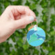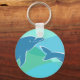 The keychain's design is of graphic dolphins over a blue and green background.
