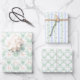 This Christmas gift wrap set features a preppy grandmillennial design featuring a • Blue and Green Holly Trellis pattern with deer in the centre of each diamond, • Holly leaf and blue stripe pattern, • Blue and green Holly trellis without deer.
