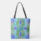 A floral pattern design, this tote bag displays drawings of flowers on a blue and green background. Get yours today!