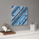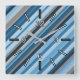 This square clock design features stripes coloured various shades of blue and grey. It also features rectangles marking the hours, and numbers indicating the hours "12", "3", "6", and "9".