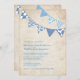This beautiful and chic wedding invitation features vintage looking ivory cream beige and teal or turquoise blue flags with polka dots, stripes, and damask patterns creating a stylish banner across the top. This whimsical design does great for outdoor backyard weddings in the spring and summer as well as fall or autumn time. Look in my shop for matching products!