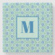 This coaster features a repeating pattern, designed in shades of blue, light turquoise, and vivid azure. This pattern resembles interlocking, small wheels.