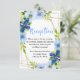 This fun and whimsical wedding reception enclosure card features watercolor baby blue and navy blue flowers with foliage on a gold geometric frame. The text combines handwritten script and serif fonts for a stylish and modern look. This is perfect for a spring or summer rustic wedding.