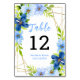 This beautiful and elegant wedding table number sign features watercolor baby blue and navy blue flowers with foliage on a gold geometric frame. The text combines handwritten script and serif fonts for a stylish and modern look. This is perfect for a spring or summer rustic wedding.