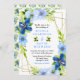 This fun and whimsical wedding invitation features watercolor baby blue and navy blue flowers with foliage on a gold geometric frame. The text combines handwritten script and serif fonts for a stylish and modern look. This is perfect for a spring or summer rustic wedding.