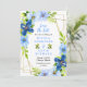 This fun and whimsical save the date invitation features watercolor baby blue and navy blue flowers with foliage on a gold geometric frame. The text combines handwritten script and serif fonts for a stylish and modern look. This is perfect for a spring or summer rustic wedding.