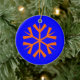 This blue ornament features a bright orange snowflake on each side. Add text to this customisable ornament for that personal touch.