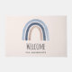 Welcome doormat with a cute and whimsical rainbow. Blue and peach watercolors.