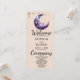 Introducing our Celestial Charm Wedding Program, a captivating and enchanting addition to your celestial-themed wedding celebration. This program boasts a sophisticated pink champagne background, setting the stage for a modern and ethereal design. Against this soft and elegant backdrop, a striking crescent moon in shades of blue and purple takes centre stage, surrounded by wispy clouds that seamlessly blend into the celestial expanse. Accentuating the moon and clouds are an array of white, yellow, and gold stars, forming a celestial constellation that adds a touch of celestial magic to the overall design.