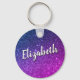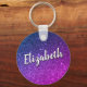 Blue and purple sparky personalized keychain for her. It features a vibrant blue and gray background depicting shining and sparkling stars designed to look like a scene from a nebula or galaxy in space. This shiny bright key chain is personalized with a white distressed custom name. Customize it by changing the sample name Elizabeth into your name or any name you wish to put on it. Makes a lovely small and affordable personalized gift idea.