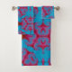 A bathroom towel set with a turquoise blue and red Persian-inspired pattern.