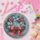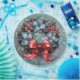 On a sparkly blue Christmas background, sits this pretty shades of blue wreath, with a red ribbon and flowers