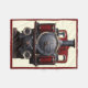vintage train in the steampunk style in red and blue colors with wheels, windows, nose, nuts and bolts, metal rings, red metal facade, and grey blue facade and looks like a toy. color photography of the front of an antique steam train in smooth metallic muted colors in reds and blues.