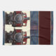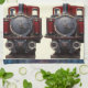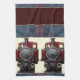 vintage train in the steampunk style in red and blue colors with wheels, windows, nose, nuts and bolts, metal rings, red metal facade, and grey blue facade and looks like a toy. color photography of the front of an antique steam train in smooth metallic muted colors in reds and blues.